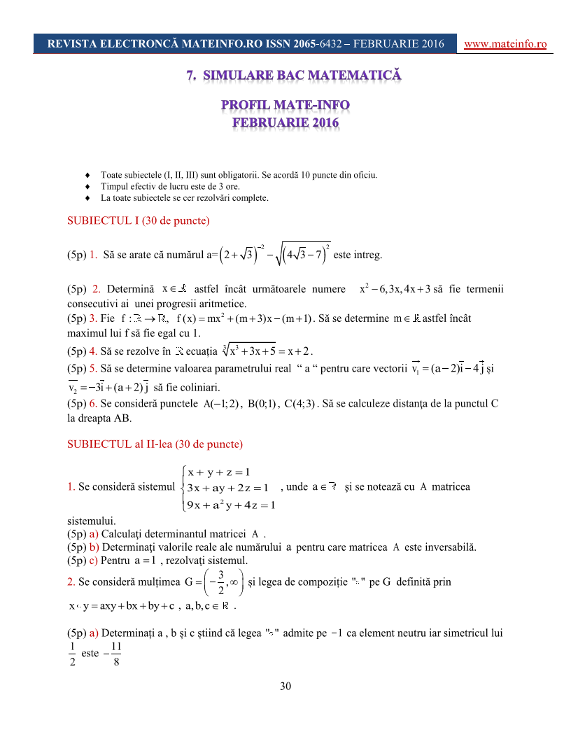 Simulare BAC Matematică Mate-Info - FEBRUARIE 2016