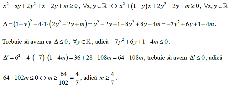 \[x^2-xy+2y^2+x-2y+m\geq0\\ rezultate:a)m=2;b)m=3;c)m\leq\dfrac{5}{7}\\ d)m\geq\dfrac{6}{7};e)m\geq\dfrac{4}{7}\]