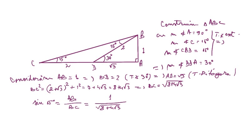 - clasa a 7-a, geome, trigonometrie, sin 15 = ? , rezolvare mai usoara