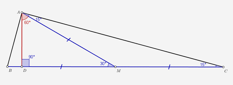 Prima data demonstram implicatia \(m\left (\angle BCA \right )=15^{o}\Rightarrow AD=\frac{BC}{4}\).