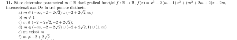 Sa se determine parametrul m ∈ R daca graficul functiei f:R->R f(x)=x3 -2(m+1)*x2+(m^2+2m+2)*x-2m intersecteaza axa Ox in 3 puncte distincte .